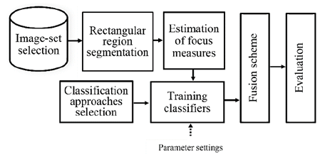 We establish the MFIF as a classification problem where the aim is to process a pair of input images, labeling their regions as focused and defocused, in order to build up a final image that merges the focused regions. The methodology begins by selecting the image set used for the training and testing stages. After the image set was defined, we selected focus measures reported in the literature and machine-learning-based classifiers. The training process and the image fusion were the next methodological stages. Finally, we carried out an evaluation step to compare the behaviors of the selected classifiers. Figure 1 shows a block diagram of the methodology used.