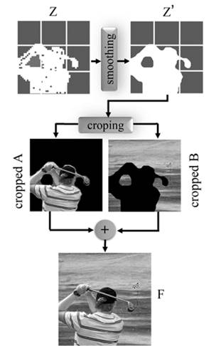This stage begins by applying the morphological operation close to group individual pixels and fill holes in the binary mask. Then a low-pass filter (median blur) is applied to delete random noise and smooth the borders of the binary mask. Both operations used rectangular kernels of the same size. Finally, using the smoothed binary mask 𝑍 ′ , input images 𝐴 and 𝐵 are cropped to generate the fused image 𝐹. This process is illustrated in Figure 5.