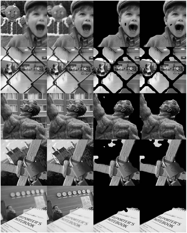 Figure 7: Results of image fusion scheme proposed for classifiers with the best fusion results: Naive Bayes and MLP. Column 1) input image 1; column 2) input image 2; column 3) Naive Bayes: near focus plane mask; column 4) MLP: near-focus plane mask.
