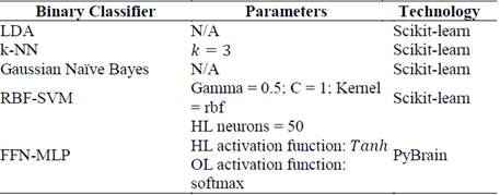 For this purpose, the Python with Scikit-learn [33] and PyBrain [34] libraries were used to configure, train, and test different classifiers.