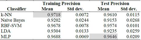 Table 2: Mean and standard deviation of classifier precision for training and test stages.