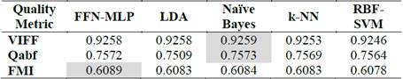 The Naïve Bayes classifier obtained the highest quality score for the VIFF and Qabf metrics, and MLP obtained the highest quality score for the FMI metric among all classifiers.