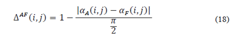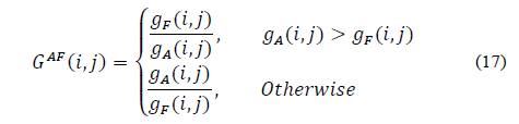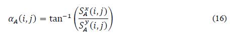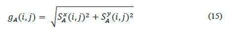 where 𝑆 𝐴 𝑥 𝑖,𝑗 and 𝑆 𝐴 𝑦 𝑖,𝑗 are the result of applying a horizontal and vertical Sobel template centered on 𝐴(??,𝑗). The relative edge strength (𝐺 𝐴𝐹 ) and orientation ( ∆ 𝐴𝐹 ) of the image A with respect to a fused image are defined as: