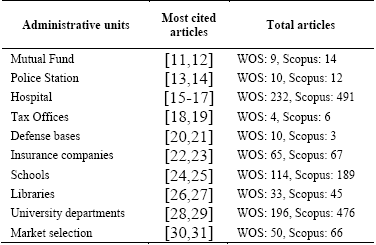 DEA is a linear programming-based technique to evaluate the performance of administrative units such as banks, mutual funds, police stations, hospitals, tax offices, defense bases, insurance companies, schools, libraries, and university departments, among others, including countries and governments [9]. In addition, it was proposed by Charnes, Cooper and Rhodes in 1978 [10]. DEA is also called frontier analysis because the performance of a unit is evaluated comparing its performance with the best performing units of a sample that forms an efficiency frontier. Moreover, if the unit is not on the efficiency frontier, it is considered to be inefficient. Therefore, this multiple-criteria method can be applied successfully to profit-making and non-profit organizations because it can handle multiple inputs and outputs as opposed to other quantitative techniques as ratio analysis or regression. Currently, there are several articles in databases like ISI Web of Knowledge, Web of Science (WOS) and Scopus about the application of DEA in administrative units, as shown in Table 1.