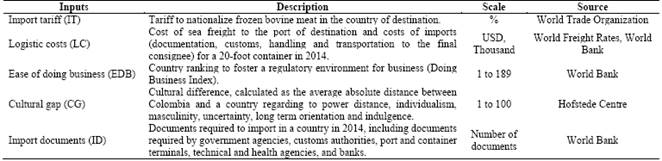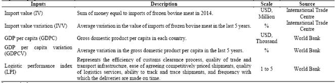In this article BCC models are used to select international markets to export frozen bovine meat based on the nature of the inputs and outputs described in Table 3 and Table 4. Criteria set by [41], [42] and the authors were taken into account to determine the inputs and outputs, which include country-level and consumer-level variables related to economic and market development, product acceptance, cultural and geographic distances, logistics, policies that facilitate the generation of business and a flow of goods, among others.