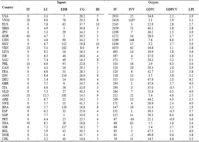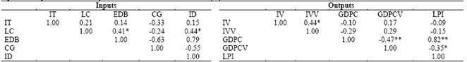 Table 6 shows a significant correlation between the logistics cost (LC) and ease of doing business (EDB), and between the logistics cost (LC) and the number of import documents required by the destination country (ID). Thus, the variable ID was eliminated because it was considered in the LC variable. Regarding output variables, there is a highly significant correlation between GDPC and GDPCV as well as between GDPC and LPI. Therefore, it has been decided to discard the GDPC. Although the GDPC has been removed, it has a representation in the model through the GDPCV variable, which takes into consideration its variation over time. This way the DEA models are left with 4 input and 4 output variables.