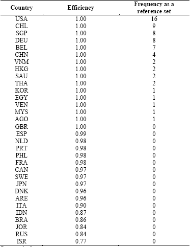 After verifying the correlations between the variables and the minimum number of countries to be considered, the proposed model is executed, obtaining each country’s efficiency and frequency as a reference set as shown in Table 7. Adjustments to the efficiency value results of the output-oriented model are done to convert those values using a 1/ϕ scale.