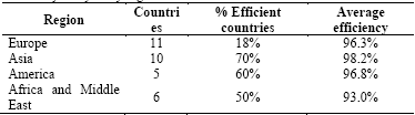 Therefore, the regions with the highest proportion of efficient countries under the output approach are Asia and America, which in turn are the regions with higher average efficiency. However, despite the fact that only 18% of the countries in Europe are efficient, the average efficiency in that region is similar to Asia and America.