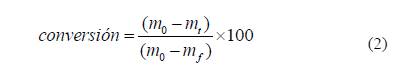 Los procesos de descomposición del crudo adsorbido en el nanointermedio se realizaron bajo atmósferas oxidantes e inertes utilizando aire seco y nitrógeno, respectivamente. Se seleccionaron la muestras con un valor fijo de = 0.2 mg/m2 para fines comparativos y manteniendo un peso inicial bajo cercano a los 5 mg para evitar limitaciones difusionales [39]. Los análisis termogravimétricos se llevaron a cabo utilizando una termobalanza Q50 (TA instruments, Inc., New Castle, DE) bajo flujo constante de 100 mL/min del respectivo gas. Previo al inicio de los análisis, las muestras son secadas a 100°C durante 6 h en una estufa para remover cualquier humedad. Los análisis se realizaron por triplicado para una tasa de calentamiento fija de 10°C/min entre 30 y 800°C, para el crudo adsorbido y para la muestra previa a la adsorción. La actividad catalítica del nanointermedio se evaluará mediante el porcentaje de conversión a determinada temperatura de la siguiente manera: