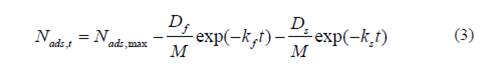 El modelo doble exponencial es utilizado para describir el comportamiento de la cantidad adsorbida en función del tiempo de contacto. El modelo da cuenta del proceso adsortivo teniendo en cuenta un periodo de adsorción rápida y un periodo lento. La ecuación que describe el modelo doble exponencial es la siguiente [40, 41]: