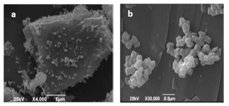Figura 1: Imágenes SEM del nanointermedio obtenido para aumentos de a) х4000 y b) х30000.