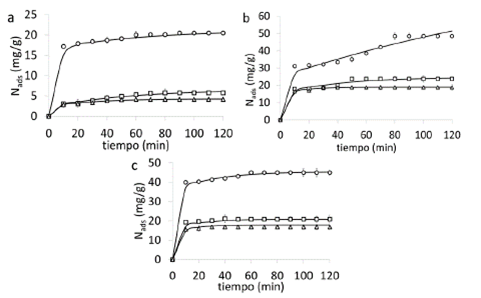 Figura 2: Cinéticas de adsorción de crudo en a) soporte de SiO2, b) nanopartículas de magnetita y c) nanointermedio para concentraciones iniciales de 100 (∆), 300 (□) y 500 mg/L (○) a 25°C y pH = 7. Los marcadores son los datos experimentales y la línea continua representa el modelo doble exponencial.