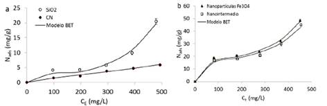 En la Fig. 3 se presentan las isotermas de adsorción junto con el modelo BET para a) soporte de SiO2 y cascarilla de nuez, y b) nanopartículas de Fe3O4 y nanointermedio, obtenidas a 25°C y para un pH = 7. Se observa que para el caso del soporte de SiO2, las nanopartículas de Fe3O4 y el nanointermedio, las isotermas de adsorción siguen un comportamiento tipo II según la clasificación de la International Union of Pure and Applied Chemistry (IUPAC) [34]. Estas isotermas son características de sistemas con alta afinidad en la pareja adsorbato - adsorbente y que además fomentan un proceso de adsorción multicapa para concentraciones elevadas.