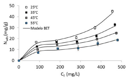 Las isotermas de adsorción se realizaron para el nanointermedio sintetizado a temperaturas de 35, 45 y 55°C para un valor de pH = 7. En la Fig. 4 se presentan las isotermas de adsorción de crudo en el nanointermedio para las diferentes temperaturas evaluadas junto con el ajuste realizado con el modelo BET. Las isotermas de adsorción presentan un comportamiento tipo II según la IUPAC [34]. Sin embargo, se observa que apra valores de > a 400 mg/L la pendiente de las isotermas de adsorción se reduce a medida que aumenta la temperatura y puede deberse a que se fomenta el fenómeno de adsorción tipo monocapa. En general, se observa que la cantidad adsorbida disminuye a medida que aumenta la temperatura del sistema. Para una valor fijo de = 290 mg/L, las cantidades adsorbidas son aproximadamente 12, 16, 18 y 23 mg/g para temperaturas de 55, 45, 35 y 25°C respectivamente. Los resultados sugieren que la temperatura tiene un efecto significativo en las fuerzas de interacción entre el crudo y el nanointermedio y que el proceso de adsorción es de tipo exotérmico [12]. Los resultados están en concordancia con aquellos reportados por Franco et al. [11,12], quienes evaluaron la adsorción de crudo en nanopartículas de alúmina funcionalizadas con residuo de refinería y encontraron que a medida que la temperatura del sistema aumenta, la cantidad adsorbida disminuye. Los parámetros obtenidos del modelo BET para al adsorción de crudo en el nanointermedio a diferentes temperaturas se presentan en la Tabla 2. En general, se observa que el modelo presenta un buen ajuste y que a medida que la temperatura del sistema aumenta, los valores de
