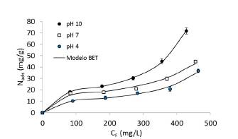 Figura 5: Isotermas de adsorción de crudo en el nanointermedio para diferentes valores de pH de 4, 7 y 10 a una temperatura de 25°C. Los marcadores son los datos experimentales y la línea continua representa el modelo BET.