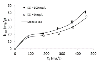 La adsorción de crudo en el nanointermedio se realizó también para emulsiones tipo O/W de crudo en agua desionizada y de crudo en una salmuera preparada con 500 mg/L de KCl. El efecto de la salinidad en el proceso adsortivo es de gran importancia debido a que generalmente las aguas de producción contienen diferentes sales que pueden afectar la interacción entre el crudo y el adsorbente. En la Fig. 6 se presentan las isotermas de adsorción para ambos sistemas en ausencia y presencia de KCl a una temperatura de 25°C y un pH = 7, junto con el ajuste para el modelo BET. Se observa que para todo el rango de concentraciones evaluado, los valores de son mayores en presencia de KCl. Esto puede deberse a que los iones Cl- actúan de manera repulsiva con aquellos grupos ácidos en la superficie del nanointermedio y favorece la afinidad entre la pareja crudo - adsorbente. Los resultados están en concordancia con lo reportado en estudios previos [11,12], en donde se evidenció que las isotermas de adsorción de crudo en nanopartículas de alúmina presentaban mejores capacidades adsortivas en presencia de una sal. El modelo BET se ajustó adecuadamente a los datos experimentales con valores de = 0.99 y