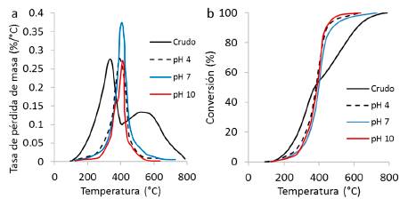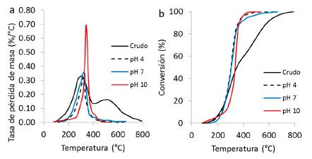 La descomposición del crudo previamente adsorbido en el nanointermedio a partir de sistemas con diferente valor de pH se evaluó mediante análisis termogravimétricos bajo atmósferas inertes y oxidantes. Debido a las propiedades del material nanoparticulado, la descomposición del crudo en presencia del nanointermedio es catalizada y logra a temperaturas inferiores que para el crudo en ausencia del nanointermedio. En la Fig. 8 se presentan a) la tasa de pérdida de masa y b) la conversión para la descomposición del crudo en presencia y ausencia del nanointermedio bajo una atmósfera oxidante. Como se observa en la Fig. 8a, la tasa de pérdida de masa para el crudo en ausencia de nanointermedio presenta dos máximos alrededor de 300 y 525°C. El primero se debe a la descomposición de los componentes livianos e intermedios del crudo y el segundo a la fracción más pesada como asfaltenos y resinas. Generalmente, la descomposición inicia mediante el rompimiento de las cadenas alifáticas más cortas y posteriormente de los anillos aromáticos presentes [52,53].