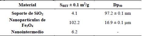 Tabla 1: Área superficial (SBET) y tamaño promedio de partícula (Dp50) del soporte de SiO2, de las nanopartículas de magnetita y del nanointermedio con 5% p/p de nanopartículas de magnetita.
