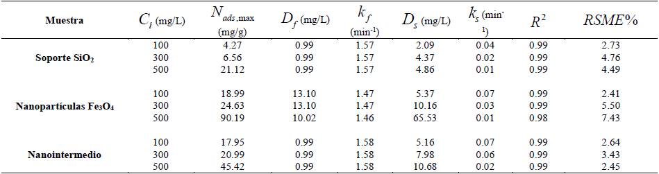 Tabla 2: Parámetros estimados para el modelo doble exponencial para la adsorción de crudo en el soporte de SiO2, las nanopartículas de magnetita y el nanointermedio para concentraciones iniciales de 100, 300 y 500 mg/L (○) a 25°C y pH = 7.