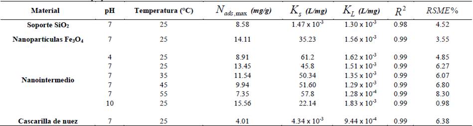 En el caso de la isoterma de adsorción para la cascarilla de nuez, esta presenta un comportamiento tipo Ib [34], características de sistemas con alta afinidad y con un comportamiento monocapa. En la Fig. 3 se observa que, para todo el rango de concentraciones evaluado, la cantidad adsorbida aumenta en el orden nanopartículas de Fe3O4 > nanointermedio > soporte de SiO2 > CN, indicando que la funcionalización de la sílice con las nanopartículas fue efectiva en el incremento de la capacidad adsortiva del material. Para una valor de = 450 mg/L donde las isotermas de adsorción pueden ser comparadas, se observan valores de