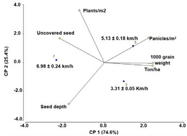 There were no significant differences in the number of panicles per m2, filled grain per panicle, 1000-grain weight, and percentage of sterile spikelet with respect to the sowing speed. Fig. 6 shows a principal component analysis. The number of panicles per m2, 1000-grain weight, and yield were higher for the 5 km/h sowing speed, followed by 3 km/h (Figs. 7-8). The weight and length of the panicles per plant was higher in the 7 km/h plots planted.