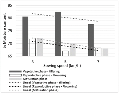 The weight of the plant presented statistically significant differences in the vegetative and maturation phases; the higher weight were sowing speed of 5 km/h. Therefore, the percentage of dry matter and moisture content varies throughout the different phases. The plots sown at 7 km/h had the lowest percentage of moisture (Fig. 4). Water stress and temperatures below 35 °C influence moisture content in the reproductive phase. During this phase, plots sown at 3 km/h had a higher moisture content (plots with lower plants population). Temperatures may affect pollen formation, grain fertility [34], and decrease potential yields by up to 50% [35].