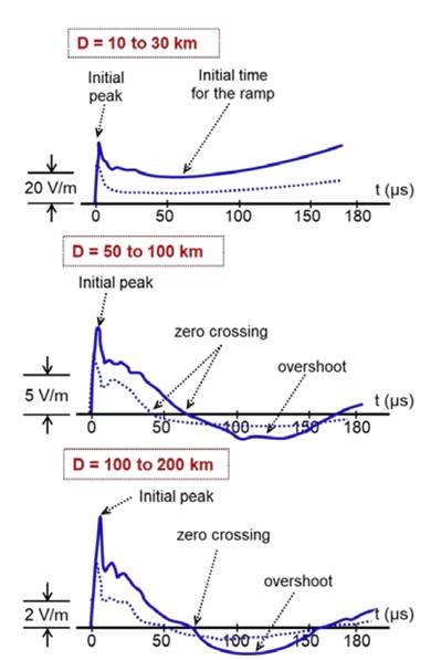 The most relevant characteristics of these waveforms include: (a) an initial peak with an acute shape (due to a high rate of growth) that decreases approximately with the inverse of the distance; (b) a slow descent ramp after the initial peak that may last more than 100 μs in signals recorded in a nearby range (few tens of kilometers); (c) a zero crossing point that may be several tens of microseconds after the initial peak for the fields registered at distances greater than 50 km; and (d) an opposite-polarity overshoot typical of the electric fields recorded at distances greater than 100 km.