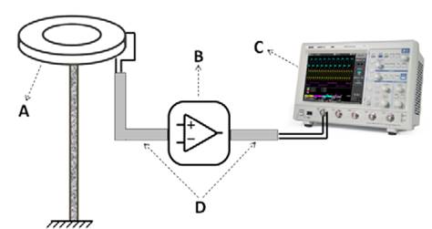 Figure 2: Lightning electric field measuring system. (A) parallel-plate antenna, (B) electronic circuit, (C) oscilloscope, (D) coaxial cables.