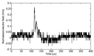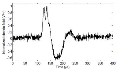 Reviewing Fig. 3 and Fig. 4 it can be seen the presence of noise components that makes it difficult to analyze and characterize the signal features. This is relevant especially in the estimation of temporal lightning parameters, such as: maximum value, signal rise-time (10-90%), zero-crossing time and the maximum electric field derivative, which is an important parameter to estimate the maximum variation of lightning current.