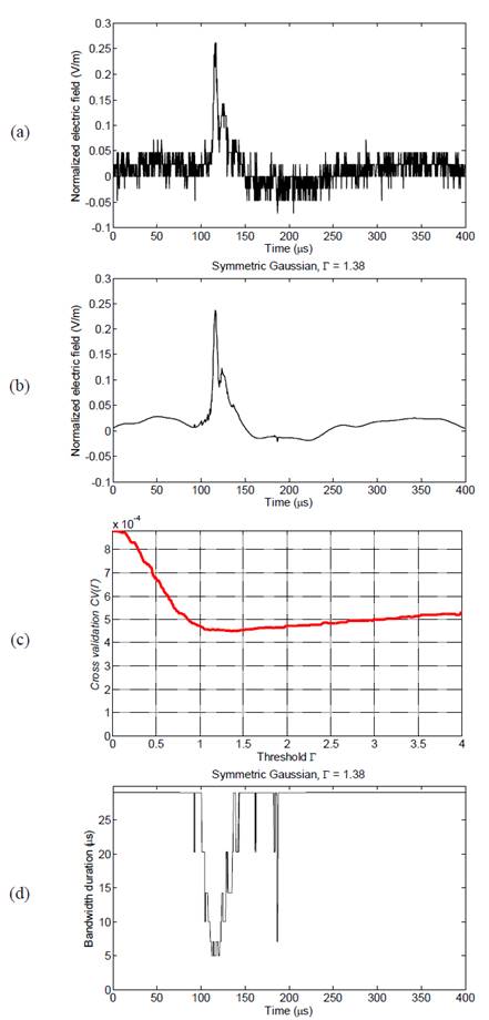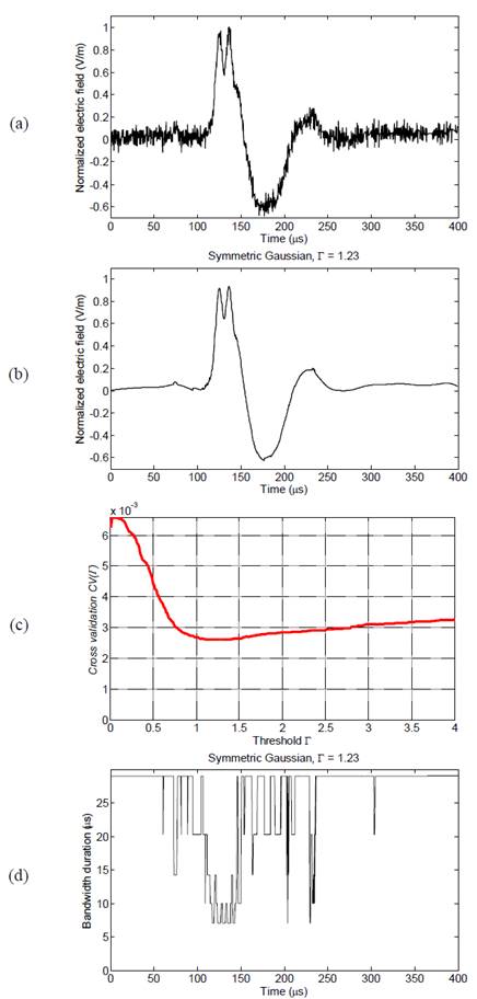 For the example given in Fig. 5(a), the best estimate using a symmetric Gaussian window is presented in Fig. 5(b). In this case, the graphical results illustrate a substantial improvement in the signal features when Γ=1.23. This result is reinforced by the behavior of the threshold parameter with respect to the CV criterion shown in Fig. 5(c).