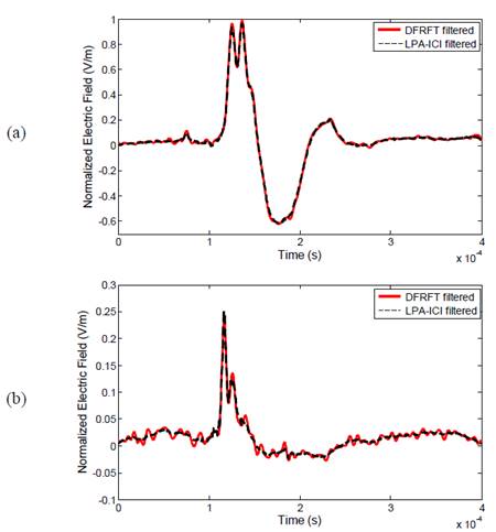 For zero-crossing time and maximum electric field, the differences for both examples were less than 2% and 7%, respectively. The main difference (up to 9%) is presented in the estimation of the maximum value of the electric field derivative for SRS signature (Fig. 8b). This is due to the difference between the maximum value of the filtered signal using LPA-ICI and the output signal obtained with the method based on DFRFT.