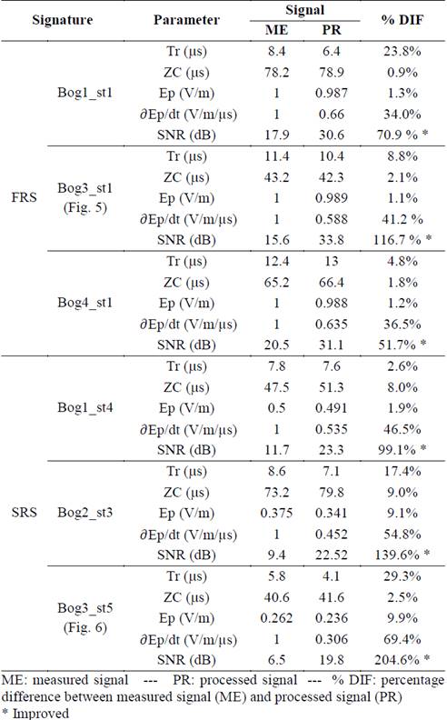 From the results presented in Table 1, it can be observed that the rise-time presents a difference up to 23.8% and 29.3% in the FRS and SRS cases, respectively. These differences may produce inadequate interpretation of lightning parameters. For the zero-crossing time, the differences were less than 3% for high SNR environments (FRS), while for the low SNR signals (SRS) a maximum difference of about 9% was found (signature Bog2_st3).