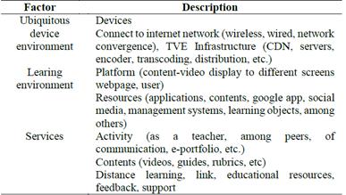 U-learning and video platforms everywhere can contribute to overcome these challenges. U-learning is one of the application fields of ubiquitous computing, whose founder was Mark Weiser [10]. He laid out that computing would be everywhere, in a transparent and invisible way to the user. Ubiquitous learning or u-learning is defined as the learning that can be obtained by using any device, at any time and place, and is embedded in everybody’s daily life [11-13]. U-learning covers other ICT models for education such as computer based training-CBT, e-learning, m-learning, and t-learning, by using different ICT resources.