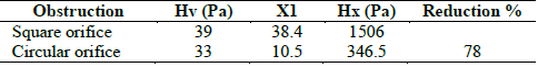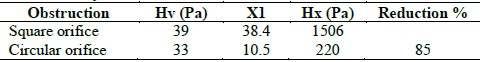 Through the ventilation bench, the shock losses, using square orifice, were determined, and were compared with shock losses, generated when a circular orifice was used. Table 5 presents a summary of results. The reduction percentage of the losses clearly shows that, when the section is properly designed, an energy saving, of approximately 78% can be achieved, when the frequency is 60 Hz. Weather conditions in the laboratory were: 29°C dry temperature and relative humidity of 62%.
