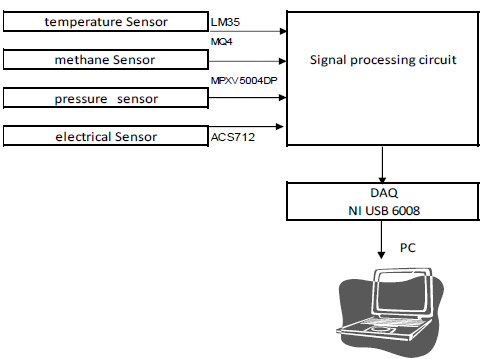 “The design and optimization of the test bench is focused on the analysis of parameters such as temperature, pressure, presence of methane (CH4), electrical current and voltage. The software used for developing the monitoring system is LabVIEW 2011; this software is a graphical programming platform that facilitates the progress from design to test. The basic outline of the structure consists of sensors, a signal processing circuit of a data acquisition card and a computer as is shown inFig. 1. The following sensors were used in the system: ACS712 for current, LM35 for temperature, MPXV5004DP for pressure, MQ4 to detect Methane (CH4); as a sensor for measuring the voltage, one step-down transformer was used. The NI USB 6008 data acquisition card (DAQ) is chosen, as it provides a basic functionality for applications such as simple data logging, portable measurements, and academic lab experiments. This card has 12 channels of analog input and two analog output channels with a sampling rate of ten kS / s. The centrifugal fan was replaced by a Blower or G2D180-AE02-01 manufactured by EBM-Papst Industries Inc. (220/280 V, 50 Hz, 415W, 2350 rpm)”. [10]