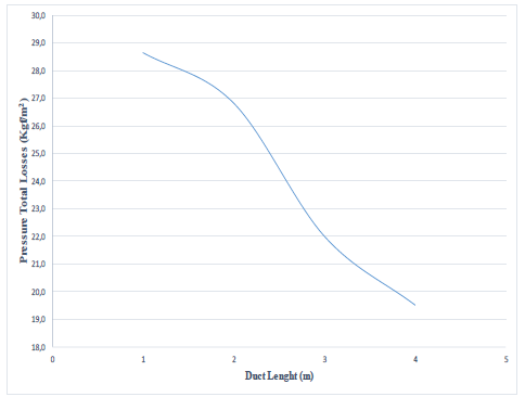 Total losses of pressure were analyzed, varying the length of the duct; where: L1 is 45cm =1, L2 = 2L1=2 and so on. Weather conditions in the laboratory were: 29°C dry temperature and relative humidity of 78%, frequency 60 Hz. Fig. 4 illustrates that at greater numbers of joints, pressure losses are more significant.
