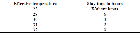Table 2 defines the dwell times of the personnel according to the effective temperature of the air (Article 218 of decree 1886 of 2015).