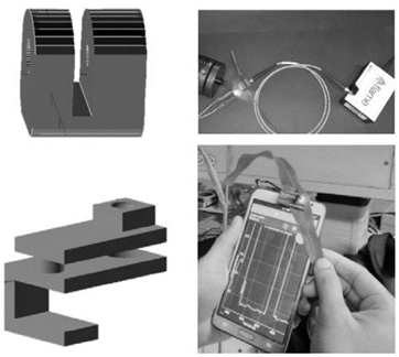 The general approach consisted in obtaining reference transmission spectra from sorghum (Sorghum bicolor (L.) Moench) plant leaves using a standard fiber optic spectrometer, in order to detect minimum transmission red bands, commonly linked to chlorophyll absorbance by intact leaves. Then, we picked a LED (light-emitting diode) with an emitting band peaking around the minimum red band transmission by these leaves. To obtain values of light transmission through plant leaves, two adapters were designed using the free software OpenScad, and further printed on a ROBO™ 3D printer using PLA (polylactic acid) filament. One of these adapters allowed to locate the leaves between a light source and the optical fiber coupled to the detector of a spectrometer. Another accessory allowed the positioning of a plant leaf between the ambient light sensor of the smartphone and the red emission LED (Fig. 1).