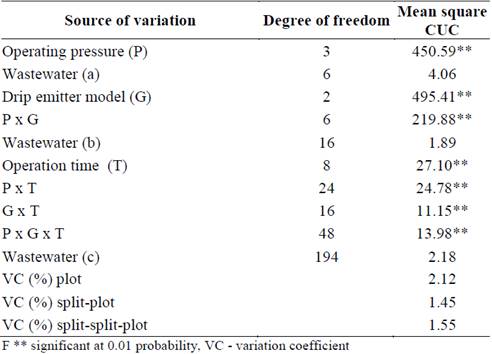 Table 5 shows mean rates of CUC variable of drip irrigation units for emitter factor within each operation time and operating pressure level using wastewater from the processing of cashew nuts.