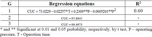 A quadratic effect of the operating pressure and a linear effect of the operation time in the change of CUC rates were registered in irrigation units with emitter G1. In this case, the regression equation adjusted to the CUC rate showed a coefficient (R2) of 0.60. Results corroborated those obtained by [5], who worked with non-self-compensating drip emitter of 1.7 L h - 1, operating with swine wastewater and showed that the quadratic model was the one that best fitted the relationship between CUC and operation time.