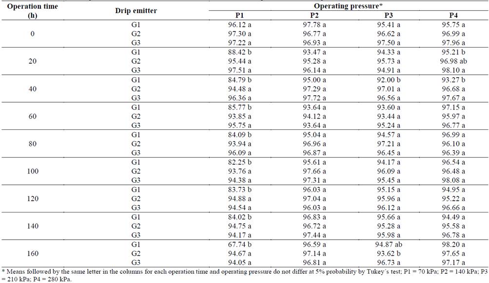 At initial operation times and 160 hours, the drip irrigation units with emitter G3 submitted to operating pressures P1, P2, P3 and P4 showed CUC rates of 97 and 94%; 97 and 97%; 98 and 97% and 98 and 97%, respectively (Figure 2C). All CUC values were rated excellent (> 90%) by [17].