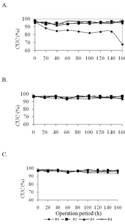 In operating pressure P2, there was no significant variation in the CUC of irrigation units with emitters G1, G2 and G3 during the 160h-operation time. The above indicated lower levels of clogging due to the predominance of effluent flow rate in the emitter that impairs particle sedimentation and biofilm formation.