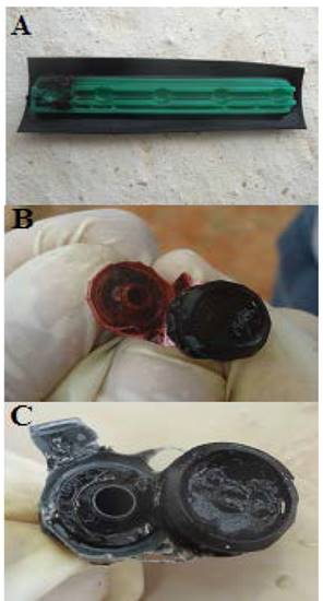 Figure 3: Drip emitters with biofilm: G1 (A), G2 (B) and G3 (C).