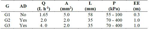 Table 1: Characteristics of drip emitters (G) used in tests: nominal flow rate (Q), self-compensating device (AD), filtration area (A), labyrinth length (L), recommended pressure range (P) and spacing between emitters (EE).