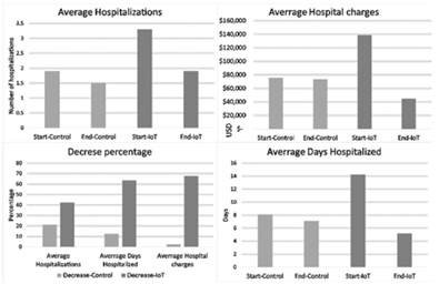 This study resulted that only 20 % of the cases studied by the tele-consultation service needed a follow up checkup, with 86% of these cases being redirected because mad image quality, proving that in this kind of examination can be time and money saver to the health provider and patient. Not only specialized test can be replaced using IoT-enabled technologies, in Arizona, United States, [26], was made a study to evaluate the effects of constant remote monitoring to patients suffering from a heart condition from December 12, 2011 to December 12, 2012. The results of this study can be seen in Fig. 7, where the comparison between the start of the program and the end clearly indicate better results of the patients using the IoT system, with decrease of the evaluated factors of at least 40%.