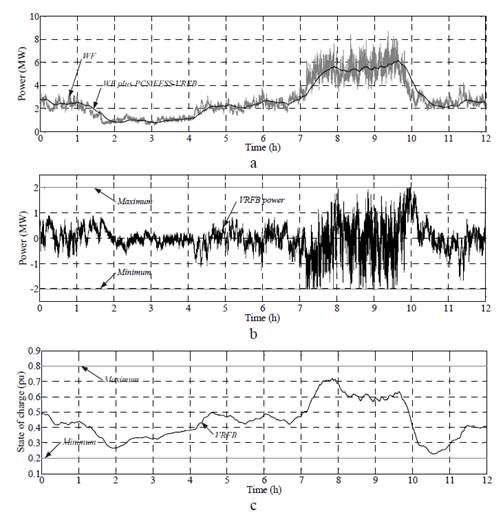 Finally, the performance of the state of charge (soc) of the VRFB is shown in Fig. 6(c). It can be highlighted that, with the control system proposed, the soc does not exceed the maximum charge (overloaded state) and does not drop lower than the minimum charge (no load state).