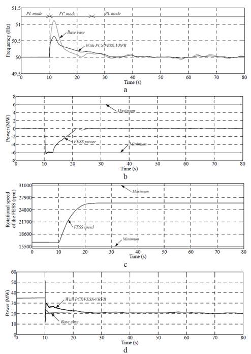 For the test system presented in Fig. 5, before the fault, the microgrid (wind farm, steam turbine, load and the PCS/FESS-VRFB controller) imports about 14 MW from the bulk power system (for the first scenario), and exports about 14 MW to the bulk power system (for the second scenario). In this state, the frequency of the system is at 50 Hz (its rated value) in both scenarios. After the opening of the MGCB breaker, the microgrid works under island conditions. In this manner, the steam turbine and the wind farm have to supply all the load; therefore, the steam turbine must automatically recover the microgrid frequency to its rated value. Figs. 7(a), 8(a) show, for both considered scenarios respectively, how the steam turbine unit can recover the frequency of the system in the base case (without the PCS/FESS-VRFB controller).