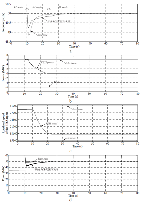 Figure 8: Results for the PCS/FESS-VRFB performance working in FC mode, second scenery (low load and high wind power). a. System frequency, b. Active power injected by the FESS, c. Rotational speed of the FESS, d. Active power of the synchronous generator of the steam turbine