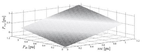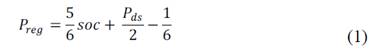 Using eq. (1), the regulator calculates the Preg , as a function of the soc and Pds . Moreover, the regulator is done while taking into account that the soc can only work between 0.2 and 0.8 of the maximum soc [22]. Fig. 3 shows the evolution of Preg according to the soc and the Pds .