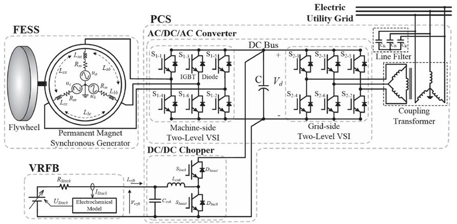 A model of the PCS/FESS-VRFB controller proposed for this study consists mainly of the PCS, the FESS and the VRFB. The PCS is the power electronic interface between the FESS-VRFB and the ac electric utility grid, pointing at reaching three aims: one is to convert electric power from the FESS to the ac grid, another is to convert the dc voltage of the VRFB to the ac grid, and the final one is to efficiently load/unload the FESS and VRFB storages. The diagram of the proposed modelling of the PCS/FESS-VRFB controller is shown in Fig. 1.